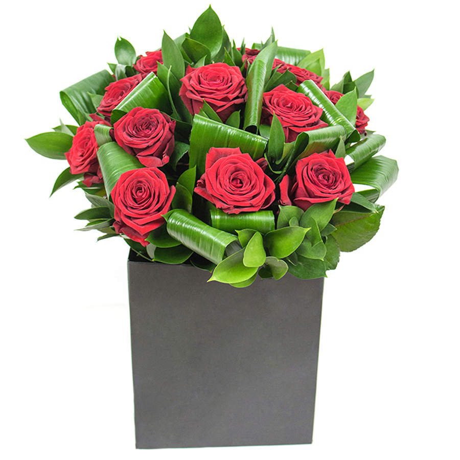 Embrace the allure of classic romance with our modern red rose bouquet, beautifully accented by aspidistra leaves and ruscus. This design showcases a perfect harmony of bold reds and soothing greens, creating a visual delight and a heartfelt expression of luxury and taste. The artistry is evident in every carefully selected bloom.